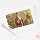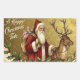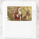 This vintage-style holiday sticker features a classic illustration of Santa Claus dressed in a traditional long red robe with white fur trim, carrying a sack overflowing with dolls and toys over his shoulder. He stands alongside a large reindeer, holding its leather bridle against a textured, gold-colored background. The scene is framed along the bottom by festive boughs of holly with red berries and mistletoe with white berries, while the greeting "A Happy Christmas Tide" appears in elegant white script on the upper left.