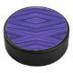A hockey puck with a vibrant purple geometric pattern, displaying layered diamond shapes. The side view shows a textured black edge. The tone is modern and bold.