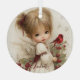 A winged child in flowing white shares a quiet moment with a red cardinal, framed by festive holly. The artwork glows with seasonal magic and innocence. Personalize the name to create a keepsake full of meaning.