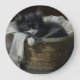 This painting focuses on an adorable black and white kitten nestled on top of a white blanket in a basket tucked in a cozy corner. The kitten's eyes are bright and curious, and it appears to be playfully reaching for the fringe on the edge of the blanket. The little white strings of the fringe are just so tempting! The surrounding area is dimly lit, creating a sense of warmth and intimacy. The painting exudes a feeling of comfort and tranquillity, as if the viewer has stumbled upon a serene moment in the life of this playful little feline. The details in the painting all come together to create a charming and endearing scene that will delight any cat lover.