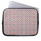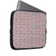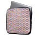 A laptop sleeve with a colorful, geometric pattern in orange, blue, and pink hues. The sleeve is slightly open, showing a silver laptop inside.