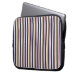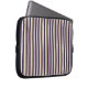 A laptop sleeve with colorful vertical stripes in purple, red, and yellow on a white background. The sleeve is shown open with a laptop partially inside.