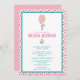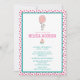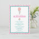 A whimsical baby shower invitation with a cute white bunny holding a big pink balloon floating up in the air. A watercolor cupcake in pastel colours positioned in the centre of the invite. Pink circles pattern fomr the background.
