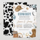 WILD WEST RODEO (BLUE) - This adorable South Western, Rodeo Cowprint, Cowboy Boy birthday invitation is fully editable, can be printed and mailed out or the birthday evite can be shared via email and social media! This Cowboy Birthday Invitation showcases a pair of Cowboy Boots & Cowboy Hat, Lasso, Cactus, a blue bandana and other western artwork surrounded by black cowprint. Also included is an optional cowprint backside. This Wild West Rodeo, Baby Shower Invitation is sure to complete any Western Themed baby shower, gender reveal, or other cowboy themed event! By using the easy to use Zazzle software (no download necessary) right in your browser, you simply purchase and personalize all in the same place. It's as easy as that!