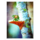 A painting of a pair of pixie sized green dragons on a mushroom that has grown on a tree. One little dragon sleeps whilst the other keeps guard.