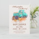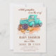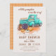 This fall design features a rustic farm truck with riding boots, pumpkins and flowers with the text "A little pumpkin is on the way" in modern typography with your personalized Baby Shower Invitation information below.