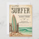 This vintage-inspired baby shower invitation features a rustic surf theme with a weathered beige background, a classic green-striped surfboard leaning against a wooden fence, and scattered seashells on the sandy shore. The scene is completed by turquoise ocean waves with a small surfboard riding the swell, evoking a nostalgic beachside charm. If you need any other matching product or customization, kindly message via Zazzle.