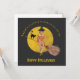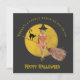 Cute Halloween altered art design features vintage school girl sitting on broom with witch's hat, black cat and golden full moon. Text : There's a little witch in all of us. Happy Halloween