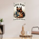 A young woman sits with her German Shepherd dog, both looking at each other with love and affection. The background features a warm, autumnal setting with fallen leaves and tall grass