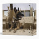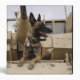 A military working dog sits on a US Army M2A3 Bradley Fighting Vehicle featured with day.