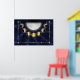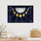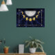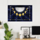 This sparkling design illustrates the lunar cycle in bright gold and deep blue. The jewels representing the moon phases run in a semi-circle from waxing crescent, to first quarter, waxing gibbous, full moon, waning gibbous, last quarter, and ending on a waning crescent. They are set against a fractal backdrop like the starry sky, with a silvery glowing moon photo from NASA to complete the piece.
