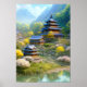This digital artwork showcases a serene Japanese town nestled by a calm river, with lush greenery and tall trees surrounding it. In the far distance, majestic mountains can be seen rising up into the sky. The town exudes a peaceful atmosphere, offering a much-needed respite from the hustle and bustle of city life. It's the perfect spot to unwind and immerse oneself in the beauty of nature.