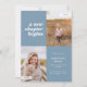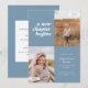 This modern graduation announcement features the words "a new chapter begins" on the top left of the card on a dusty blue background. It has spaces for two vertical photos to celebrate your graduate's journey so far, a photo from the past and a photo from the present. The front of the card has space for the graduate's name, class year, school, and future plans. The back of the card has space for additional text and can be used as a graduation party invitation or to write a personal message.