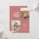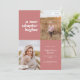 This modern graduation announcement features the words "a new chapter begins" on the top left of the card on a rose background. It has spaces for two vertical photos to celebrate your graduate's journey so far, a photo from the past and a photo from the present. The front of the card has space for the graduate's name, class year, school, and future plans. The back of the card has space for additional text and can be used as a graduation party invitation or to write a personal message.