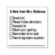 This self-inking stamp has a template. The top line says a note from and has additional text that can be changed to the teacher's name. The remaining lines of display text can be edited to show custom messages for students and/or parents. There are checkboxes to note the appropriate message.