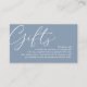 Celebrate the beginning of your journey together with our elegantly classy dusty blue crafted "gifts" wedding invitation enclosed card. Featuring a sophisticated blend of modern script and romantic allure, each card is meticulously designed to convey the essence of your special day. Perfectly suited for couples seeking a unique way to share their honeymoon dreams, this card invites your loved ones to contribute towards unforgettable experiences. Whether nestled in a luxurious envelope or presented alongside your wedding invitations, our card adds a touch of enchantment to your celebration, promising cherished memories that last a lifetime. Designed by TeeshaDerrick.