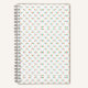 A notebook with a spiral binding features a white cover adorned with small, colorful geometric patterns. The vibrant design adds a playful and artistic feel.