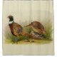 Coloured Drawing of a Ring Necked Pheasant rooster looking over his hen while she pecks for seeds in the clearing of a grass filled prairie. The Rooster is a rainbow of colours including green, yellow, oranges, blues, browns and whites. A pretty Upland Game bird.