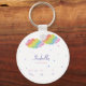 This is a personalized birth announcement button key chain with colourful designs and customizable details according to your personal preference