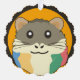 A cute cartoon hamster with a multicolored scarf is surrounded by a bold black circle centred within a circular golden background. The minimalist style and playful expression of the hamster give it a cheerful and lighthearted feel.