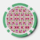 A poker chip with a floral pattern in pink and green with geometric accents on both sides, creating a vibrant and playful design.