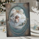 This greeting card features a vintage-style illustration of a serene angel, hands clasped in prayer, robed in flowing white and crowned with a celestial ribbon of gold and ivory. Framed in ornate filigree and nestled among pine branches and winter berries, she stands against a soft teal sky—an emblem of peace and divine presence. The words “Merry Christmas” shimmer like a whispered blessing, inviting the recipient into a moment of reflection and warmth. Perfect for sending heartfelt wishes, this card carries the spirit of quiet devotion and the gentle magic of the season.