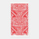 The design features a symmetrical, abstract pattern with intricate details. The design is predominantly red with black accents and has a kaleidoscopic effect due to its mirrored symmetry on both vertical and horizontal axes. The swirling shapes resemble floral or paisley elements, giving it an organic feel. It looks like it could be a tapestry or curtain, hanging from the top.