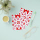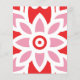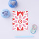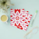 The design features a symmetrical pattern with a combination of red and white colours. At the centre, there’s a stylized floral design with layers of petals radiating outward. Surrounding this central motif are swirling elements and additional decorative shapes, creating a balanced and harmonious look. The use of just two colours makes the intricate design stand out beautifully.