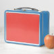 a red background with a white border metal lunch box