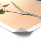 Serene background featuring a vibrant crimson bird with bright blue wings spread wide with a curved branch decorated with green and pink leaves.