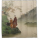 This impressionist work depicts two people walking on a ledge next to a river in ancient China. The colours used include tan, black, green, brown, grey, ginger, and ochre.