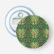"A round bottle opener with a front design featuring an intricate pattern of green trees set in circular frames on a dark background. The back is metallic and features the opener mechanism."