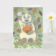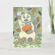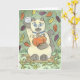 Inside verse: A sake toast to harvest time, This kitty makes it clear, Wishing you a lucky fall, And good fortune for all year. Artwork description on the back: A good luck wish for autumn. This lucky Siamese Maneki Neko is enjoying a relaxing sake break, with paw raised in a good luck toast amidst a flurry of colourful Autumn leaves. She is happily seated on her golden cushion and is holding a good fortune pumpkin for the occasion.