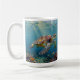 A sea turtle themed coffee mug with an illustration of a sea turtle under a calm teal sea swimming among the coral on the ocean floor with sun rays beaming down on him through the aqua water.