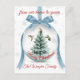 Celebrate the holiday season with this beautifully designed personalized Christmas Postcard, featuring a serene winter scene adorned with delicate hummingbirds and a snow-covered tree. The elegant blue ribbon and snowflake accents create a warm and inviting feel, perfect for sending heartfelt wishes from your family to theirs. Customize with your family name for a unique touch. Order today to add a festive touch. Pair with matching pieces.