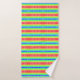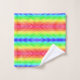 A set of towels displayed on a rod in vibrant rainbow colors with diamond patterns. Below is a folded washcloth showing the same design, evoking a lively mood.