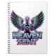 A shiny, metallic chrome angel with bold, tribal wings, surrounded by glitchy holographic effects, neon accents. Y2K style design with Heavan sent text.