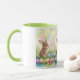 A very cute, furry bunny next to different coloured Easter eggs that will give you feel good feelings of happiness. A rainbow in the background adds to the beautiful picture & feel good on this image. Add these mugs to your collection to be the centre of attention with family, friends and colleagues! A 2 tone mug means you can choose what colour you want the inside and cup ear to be to compliment your environment. These mugs are ideal for celebrating Easter or everyday use in the house and office. The cute furry bunnies will bring a happy feeling when looking at them and sipping your drink! These mugs can also be taken with you on hiking and camping trips as well as travelling! These mugs will also serve as ideal gifts for young and old!