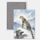 A pretty wildlife Keychain with an illustration of a majestic snow leopard perched on a craggy, snow-covered peak, gazing out at a vast, frozen mountain range.
