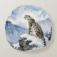 A pretty wildlife throw pillow with an illustration of a majestic snow leopard perched on a craggy, snow-covered peak, gazing out at a vast, frozen mountain range.