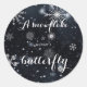 Beautiful black and white wintery design. Black background, white snowflakes and saying "a snowflake is winter's butterfly."