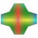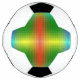 A soccer ball features a colorful geometric pattern, blending red, yellow, and green with a gradient effect. Below, the same pattern is shown flat.