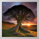 Amidst a tranquil landscape, a majestic tree stands against the sunrise. The hills adorned with lush greenery and scattered rocks create a serene scene, where the morning sun bathes everything in a golden hue. Nature's beauty unfolds in a peaceful sunrise tableau.