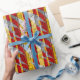 Admit One tickets with a splash of red and yellow running through. This wrapping paper is fully customizable.