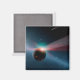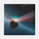 Artist's conception of a storm of comets in the Eta Corvi system, with a possible planet. One such giant comet is shown smashing into a rocky planet, flinging ice- and carbon-rich dust into space, while also smashing water and organics into the surface of the planet. A glowing red flash captures the moment of impact on the planet. Yellow-white Eta Corvi is shown to the left, with still more comets streaming toward it.