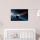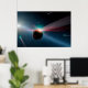 Artist's conception of a storm of comets in the Eta Corvi system, with a possible planet. One such giant comet is shown smashing into a rocky planet, flinging ice- and carbon-rich dust into space, while also smashing water and organics into the surface of the planet. A glowing red flash captures the moment of impact on the planet. Yellow-white Eta Corvi is shown to the left, with still more comets streaming toward it.