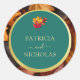 Add a touch of autumnal enchantment to your wedding with our exquisite round stickers. These charming stickers feature a rustic backdrop of autumn leaves, adorned with a shorter, teal panel framed by a shimmering gold border and surrounded by autumn foliage. The couple's names are elegantly displayed within the frame, creating a personalized and memorable keepsake.