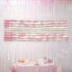 A textile displaying a pattern of pink and white s banner