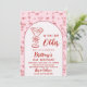 Featuring a soft blush pink background with a bold red martini illustration tied with a delicate bow, this invitation blends vintage charm with modern femininity. The arched frame layout adds a refined touch, while the hand-drawn cocktail, champagne, and bow pattern creates a cohesive, stylish look that feels elevated and trendy. The mix of elegant script and clean serif typography makes it ideal for sophisticated birthday dinners, cocktail lounges, girls’ nights, martini bars, or at-home celebrations.