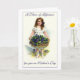 In this vintage print a pretty young girl is holding a large wicker basked filled to overflowing with Violets. She is dressed in a lovely lace dress with white high-button shoes to match. The large bow holding back her curls is the exact color of the Violets. You can change or delete the text inside the card, if you wish.